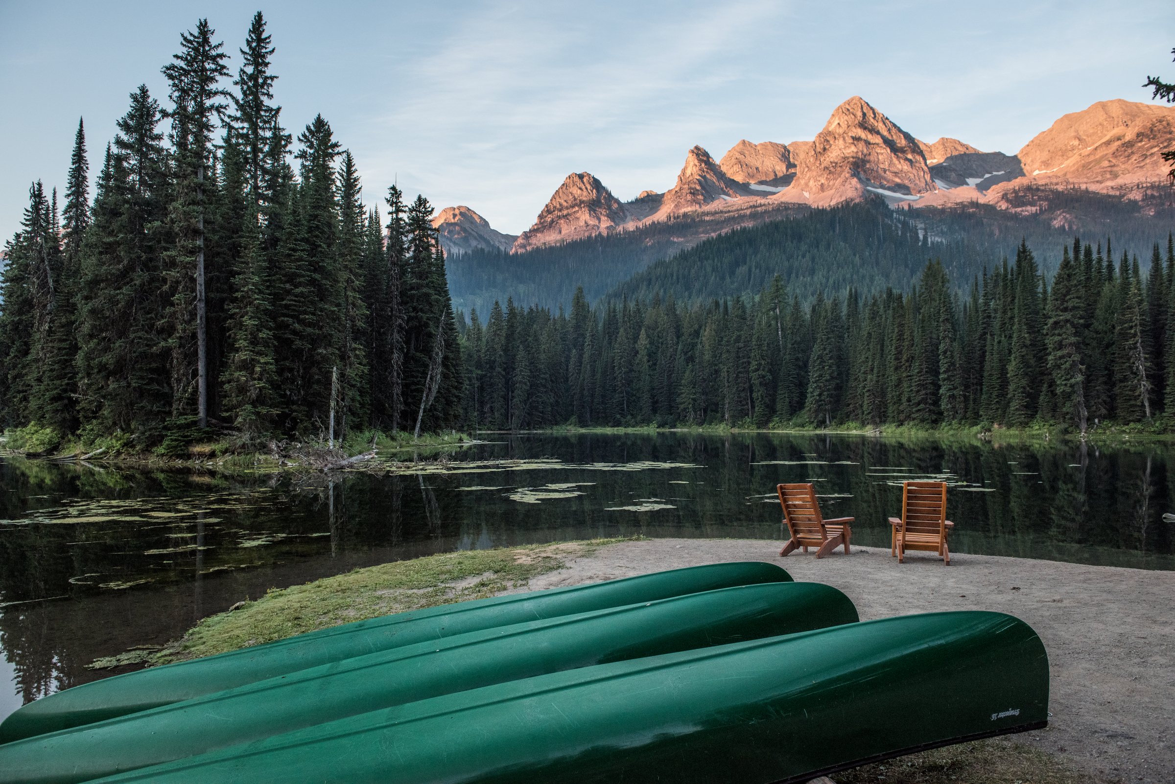 Canoes and seats on the edge of Island Lake near Island Lake Lodge near Fernie, BC