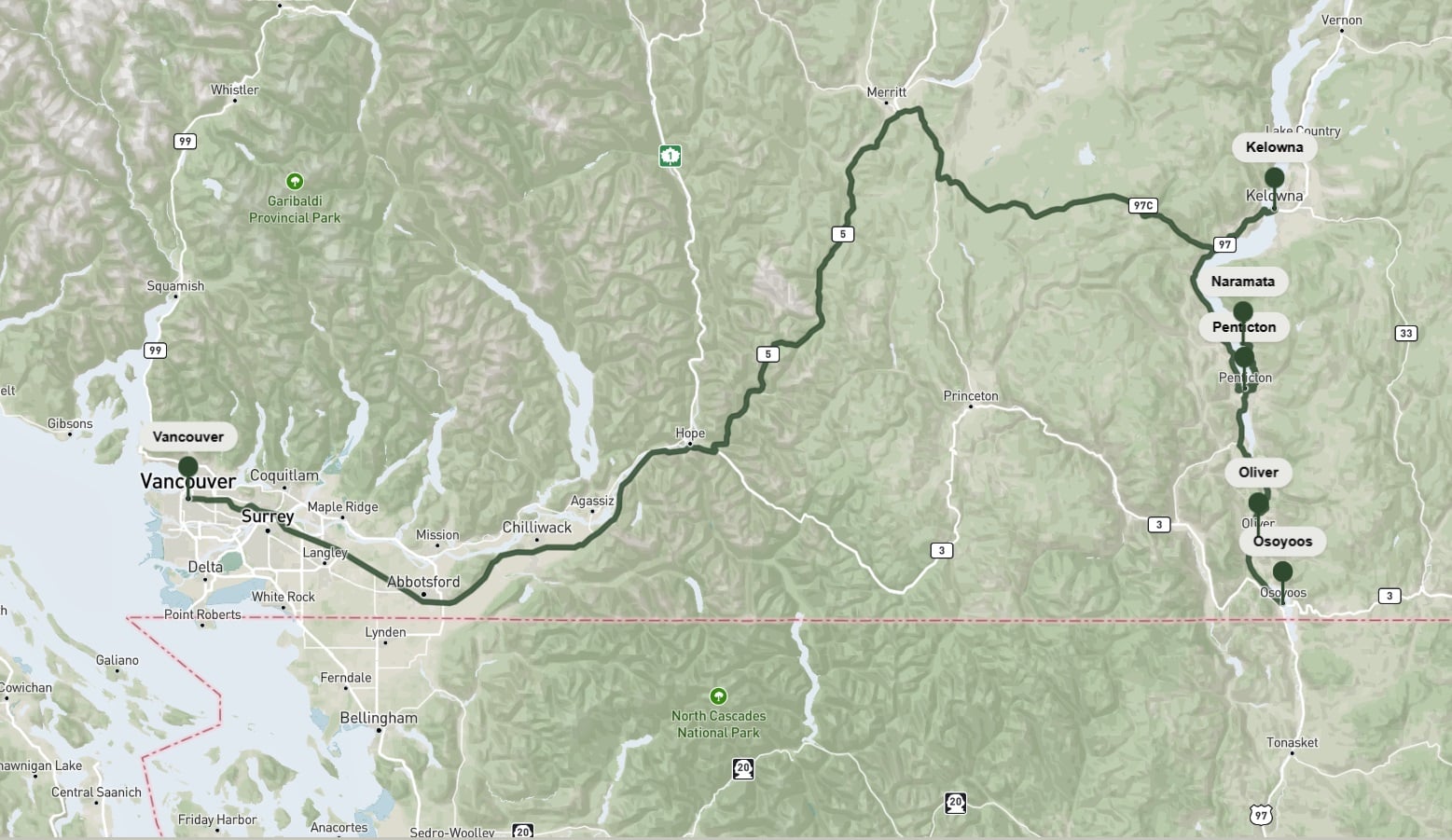 Sigue la autopista 97 hacia el sur desde Kelowna, que discurre a lo largo de la orilla del lago Okanagan, pasando por pequeñas localidades y pintorescos viñedos. Haz una parada en Summerland para dar un paseo en el ferrocarril de vapor de Kettle Valley de camino a Penticton, enclavada entre los lagos Okanagan y Skaha. Relájese en las playas locales y abra el apetito en el Parque Provincial Skaha Bluffs , con sus rutas de senderismo y ciclismo de montaña, así como más de 1.000 vías de escalada.