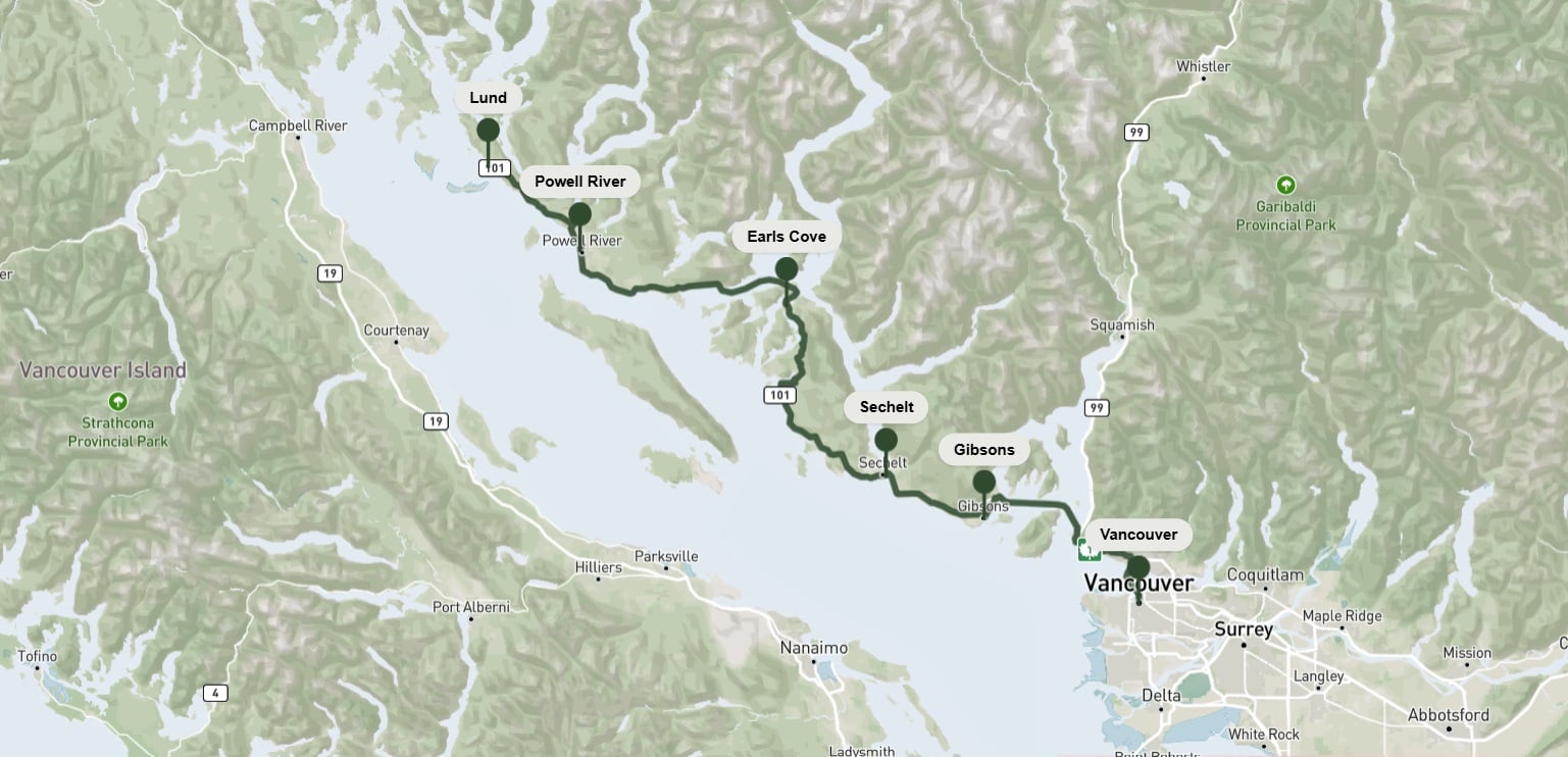 Tu viaje comienza en Gibsons, donde podrás pasear por el muelle y comprar marisco recién sacado del barco. Sigue la autopista Sunshine Coast Highway, que serpentea entre decenas de playas y encantadoras localidades. Haz una parada en Sechelt, flanqueada por el mar de Salish al oeste y el estuario de Sechelt al este, para alquilar un kayak o una tabla de SUP y luego relajarte en una terraza al aire libre con vistas al océano. Aquí también hay muchas aventuras en tierra, como extensas rutas de redes de senderos y una ruta de senderismo imprescindible para ver los impresionantes rápidos que se forman durante los cambios de marea en Skookumchuck Narrows.