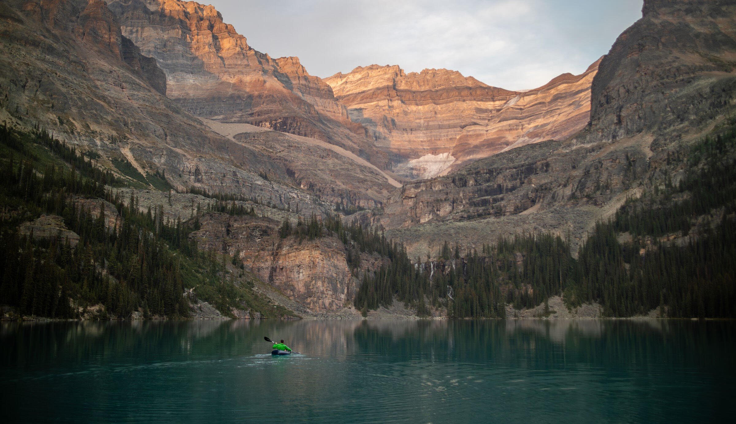 Kayakista remando en el lago O'Hara al atardecer.
