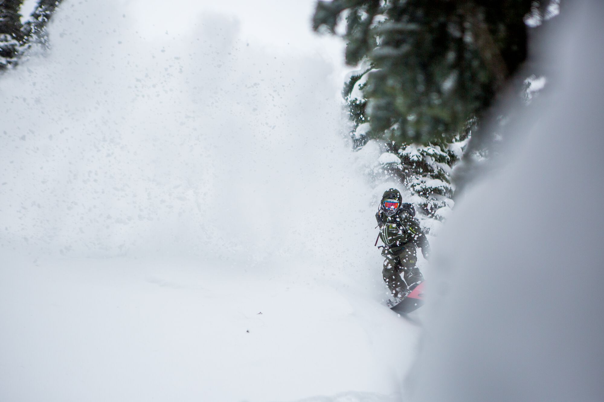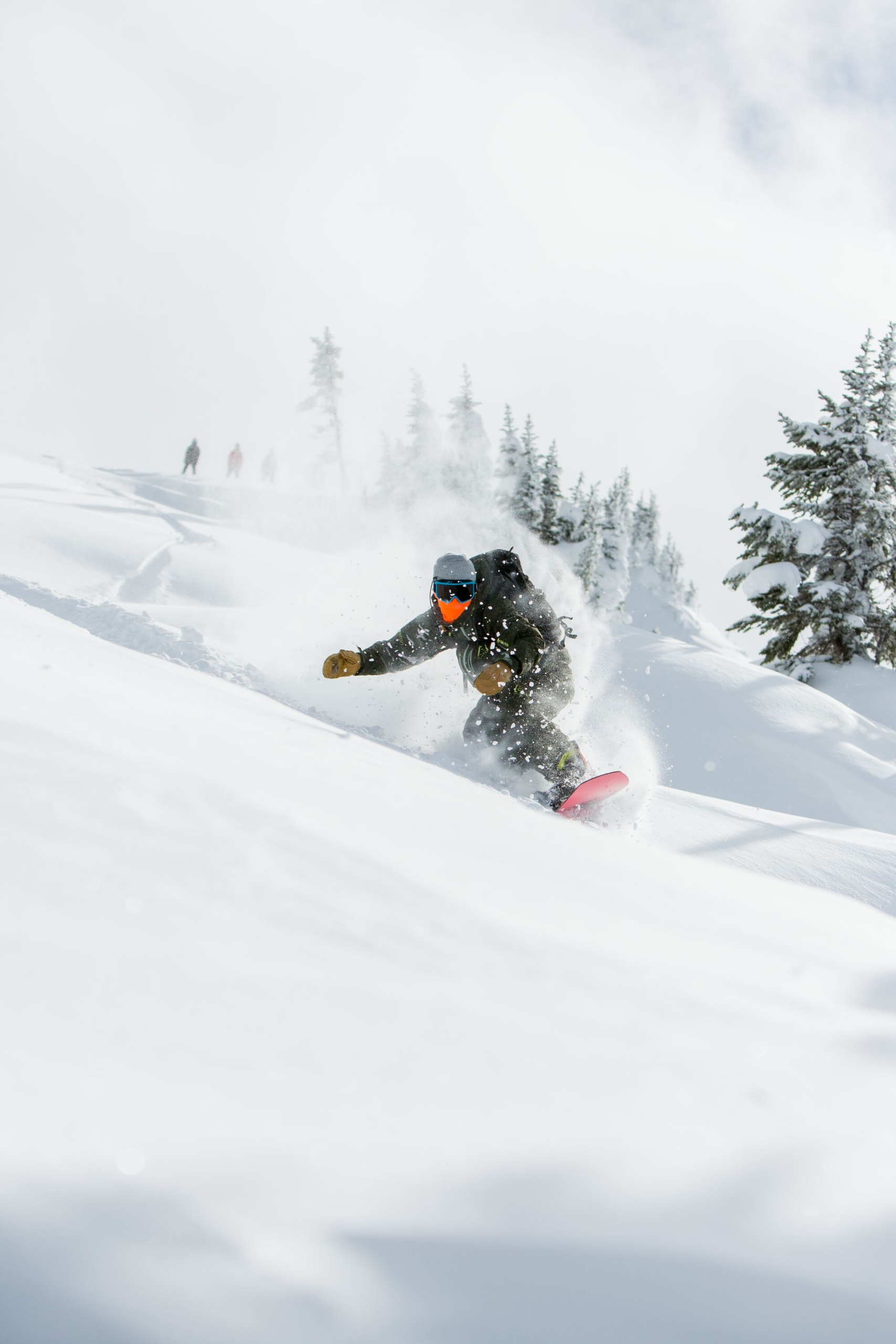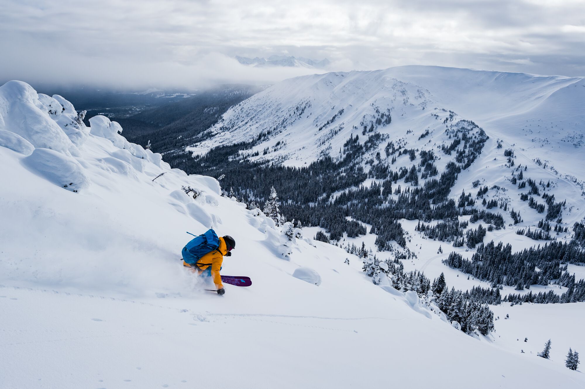 Snowboarding deep powder at Skeena Cat Skiing near Hazelton.