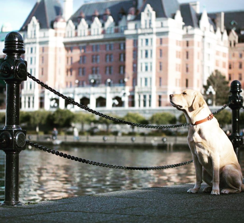 Winston, the Fairmont Empress Hotel resident doggo, stands proudly overlooking Victoria Harbour | @winstonattheempress Victoria