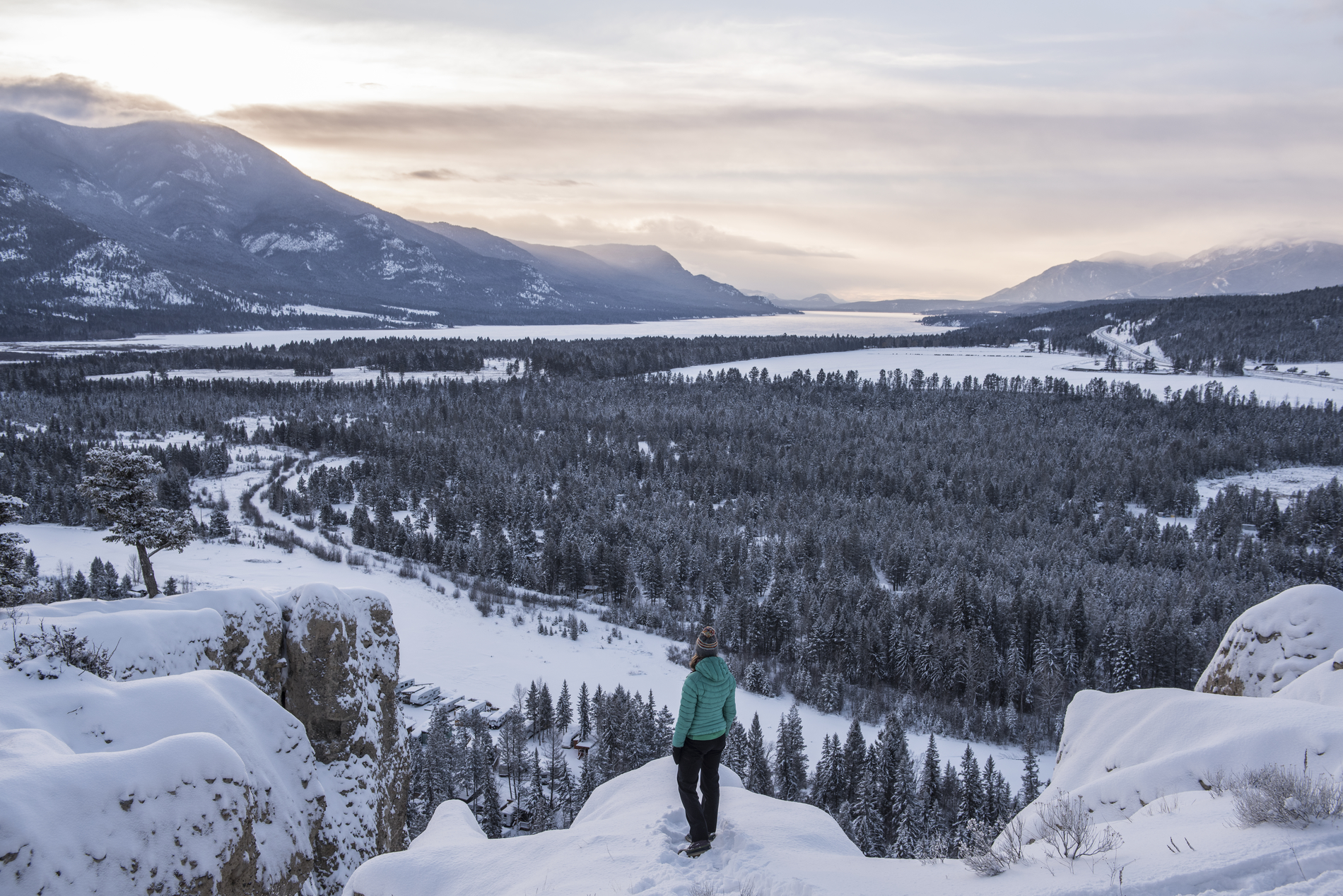 The rolling, sagebrush-covered hills of Kamloops get a dusting of white each winter and offer plenty of snowy space to explore, including 40 kilometres of trails in Kenna Cartwright Nature Park and a waterfall lookout at Peterson Creek Nature Park. Just south of town, kick your heels on 12 kilometres of marked trails near Skate Lake or bring your pup for a loop around McConnell Lake. For snowshoe views without the hike up, catch a lift up nearby Harper Mountain.